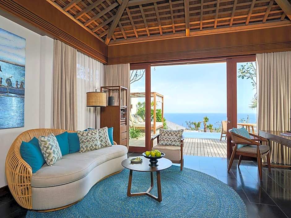 Luxurious one-bedroom villa with sweeping views of the Indian Ocean from the outdoor deck and the private pool. The villa has separate living and dining area. Modern amenities include a 49-inch flat-screen TV, a wireless speaker, air conditioning, a personal safe, and coffee/tea making facilities. Spacious bathroom comes with a double vanity, a shower, and high-end toiletries.